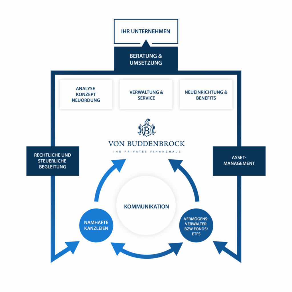 Zudem erfordert die Komplexität des Themenfeldes der betrieblichen Vorsorge eine reibungslose Zusammenarbeit von Finanz-, Steuer- und Rechtsberatung. Die Koordination der einzelnen Kompetenzen sowie der routinierte Umgang mit diesen Themenfeldern sind unser entscheidender Erfolgsfaktor.