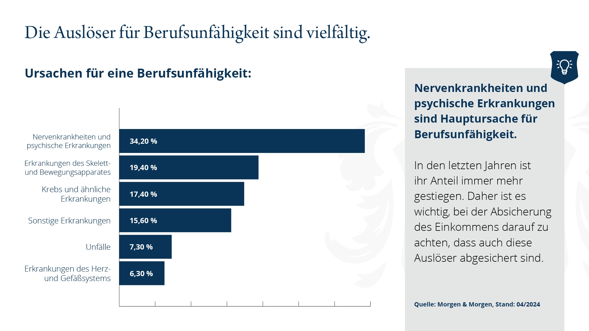 Fast jeder vierte Arbeitnehmer wird vor Erreichen des Rentenalters mindestens zeitweise berufsunfähig. Bei den heute 20-Jährigen werden im Laufe ihres Lebens 43% (ggfs. auch nur vorübergehend) berufsunfähig.